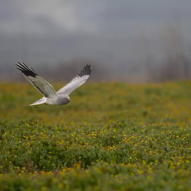 A male Hen Harrier (Cicrus cyaneus) hunting methodically above the yellowish winter meadows