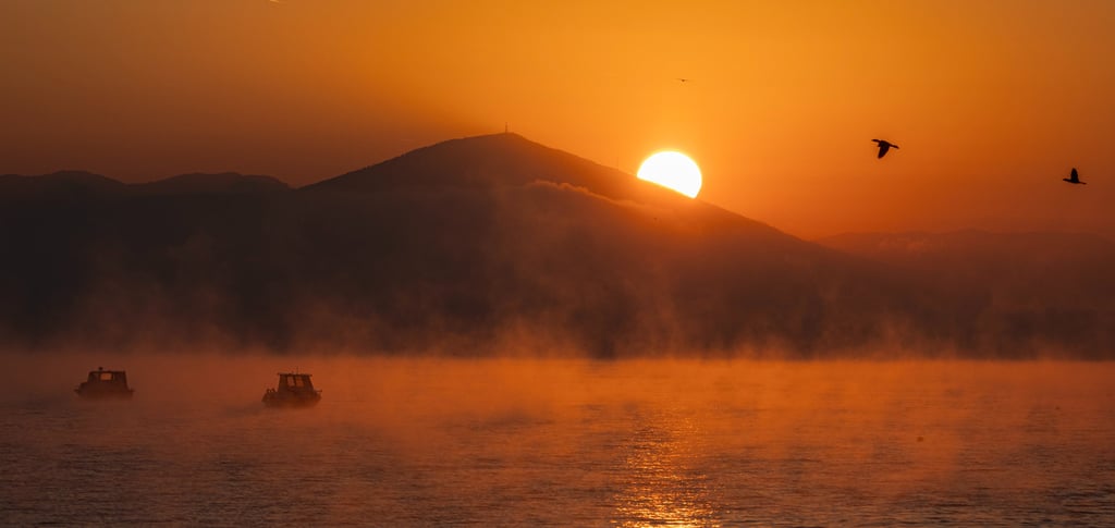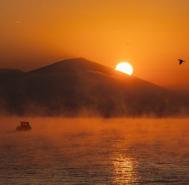 The day started quietly, with the sun rising behind Mount Chortiatis, casting warm orange tones over the Thermaikos Gulf. A soft mist sat only above the fishing boats along the coast, while the lagoon and wetlands were already clear and bright. It felt like the perfect calm November morning to explore Kalochori lagoon and the Axios Delta.