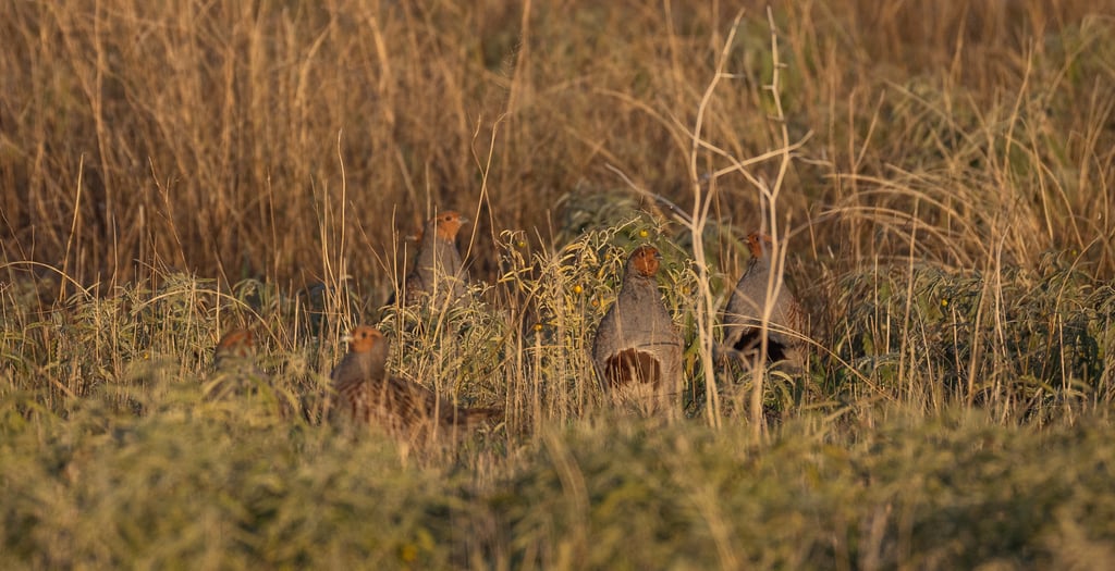 Moving towards the adjacent fields and tracks brought the dryland highlight of the morning. In the field margins, a tight and perfectly camouflaged group of ten Grey Partridges (Perdix perdix) appeared — the surprise of the day. They fed slowly in a compact covey, repeatedly lifting their heads to scan the surroundings. Seeing a healthy group of this size so close to the wetland emphasises the importance of the agriculture–marsh transition zone for farmland birds.